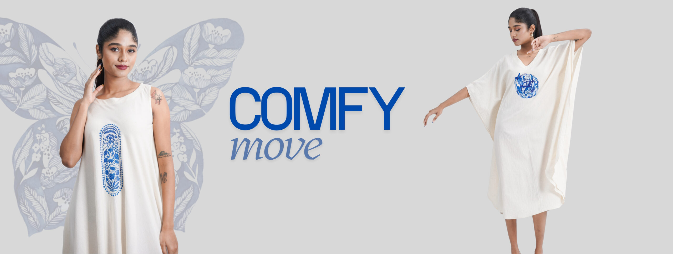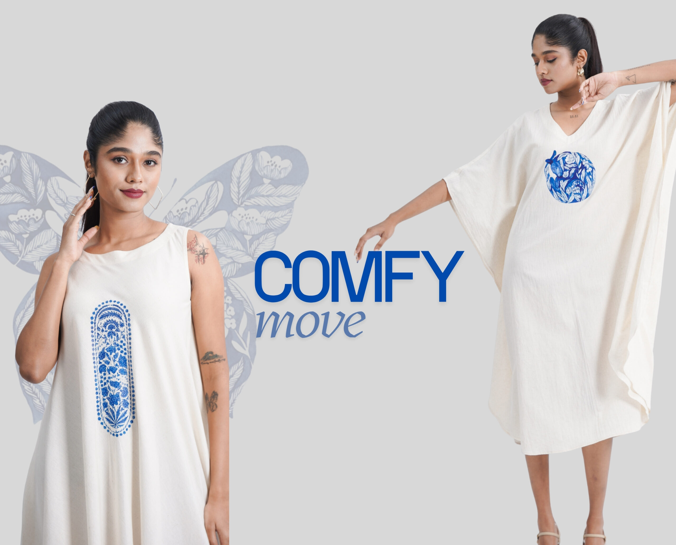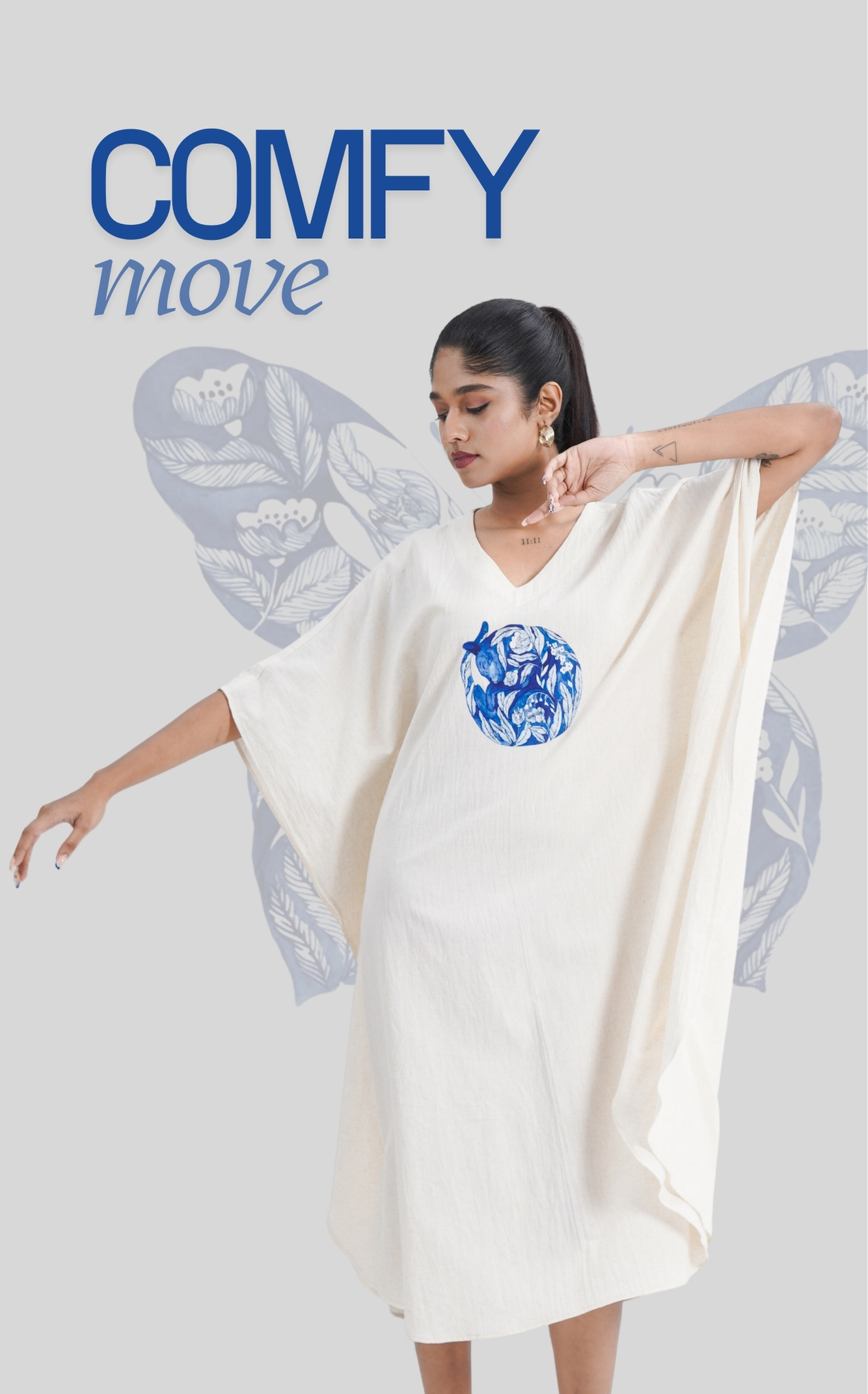 ₹1,990.00LINEN COTTON KAFTAN WITH INDIGO BUTTERFLY MOTIF