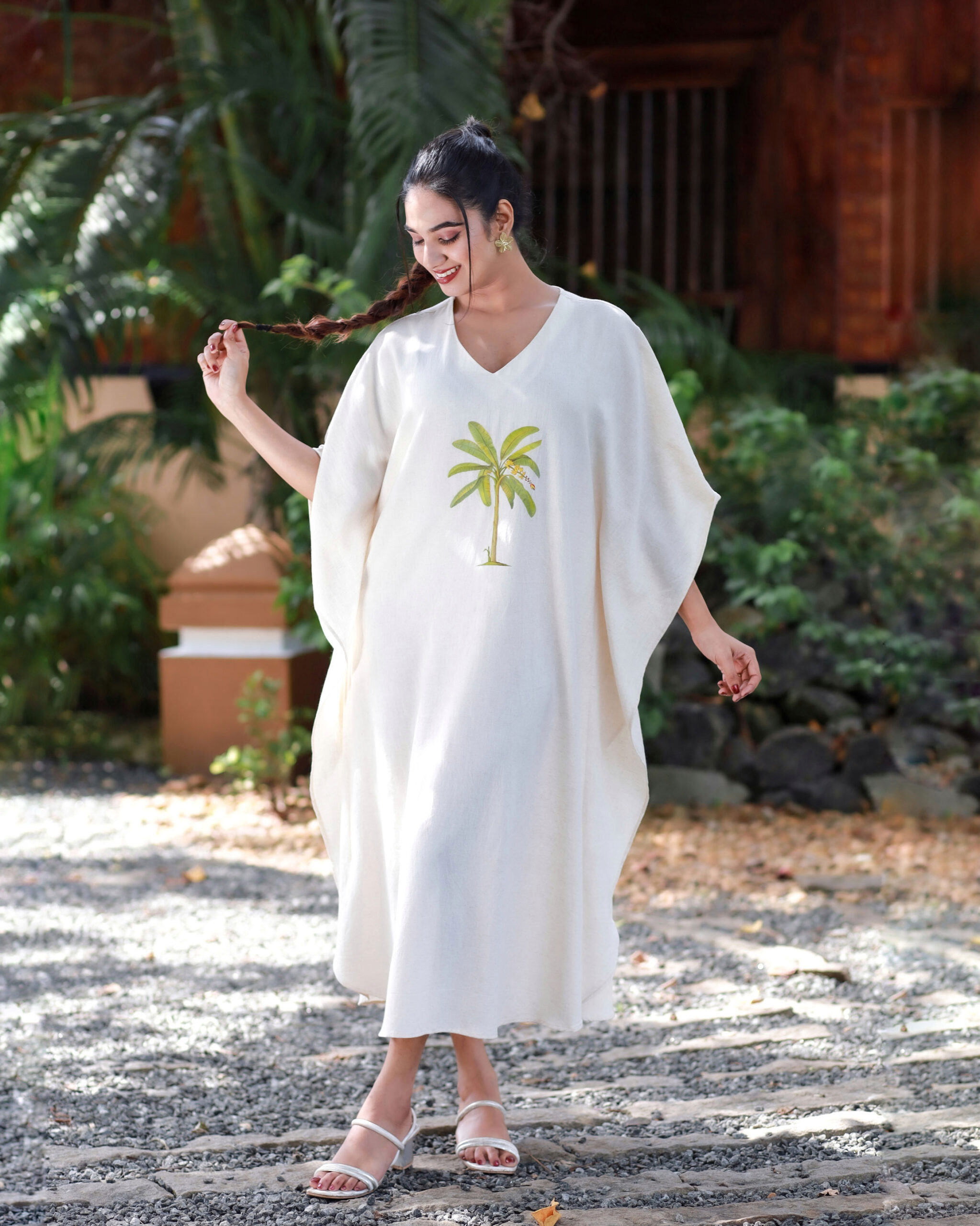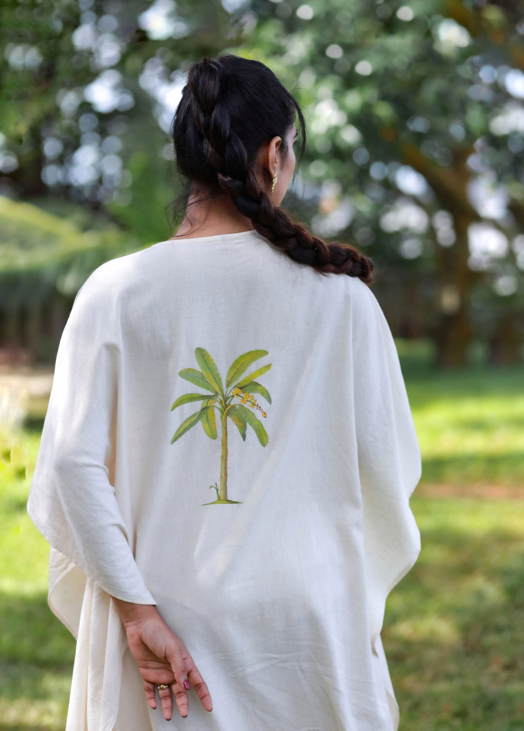 The hand-painted inspired banana tree motif adds a touch of tropical charm, celebrating nature’s beauty in the most subtle yet striking way. Its free-flowing silhouette suits all body types, making it a wardrobe essential for those who love relaxed yet refined fashion.
