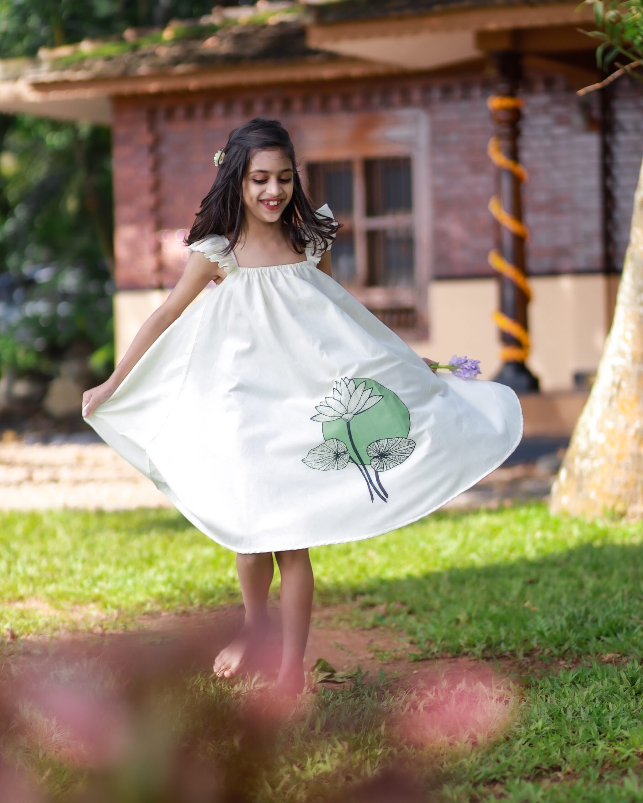 The highlight of this piece is the Moon Lotus print — a symbol of purity and grace — adding a unique charm to your child’s wardrobe. With delicate frill sleeves and a flowy silhouette, this dress ensures your girl feels light, free, and joyful while looking effortlessly stylish.