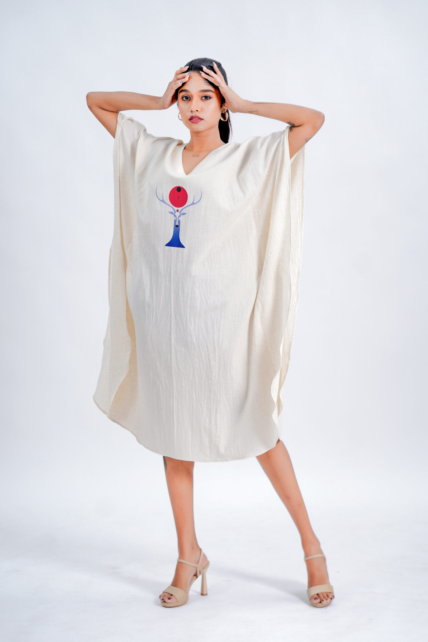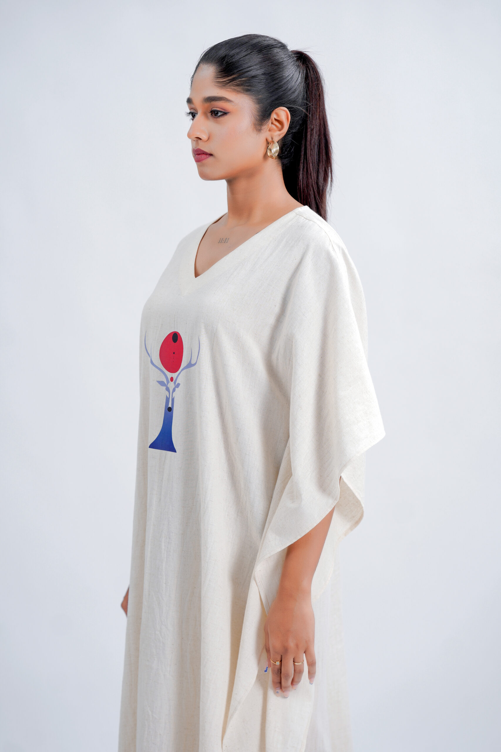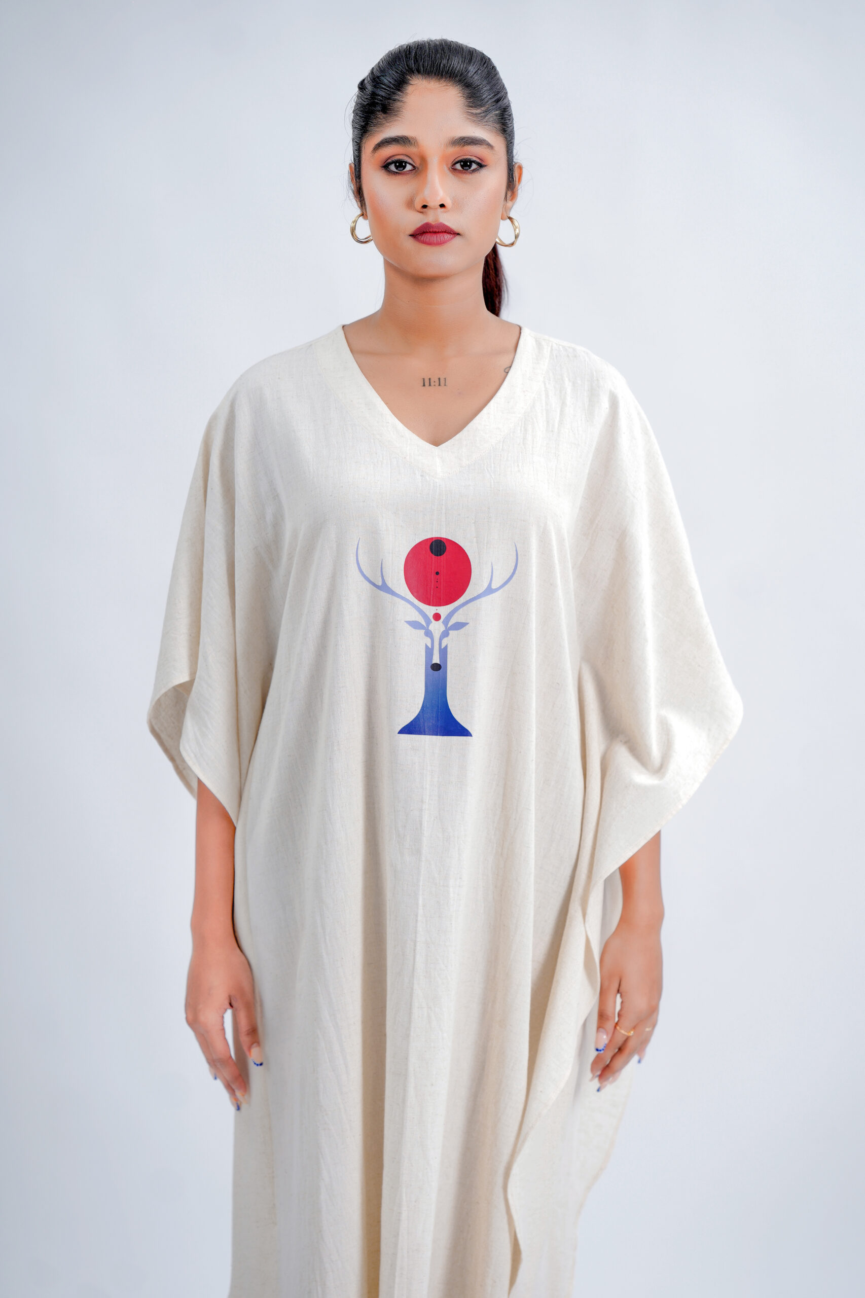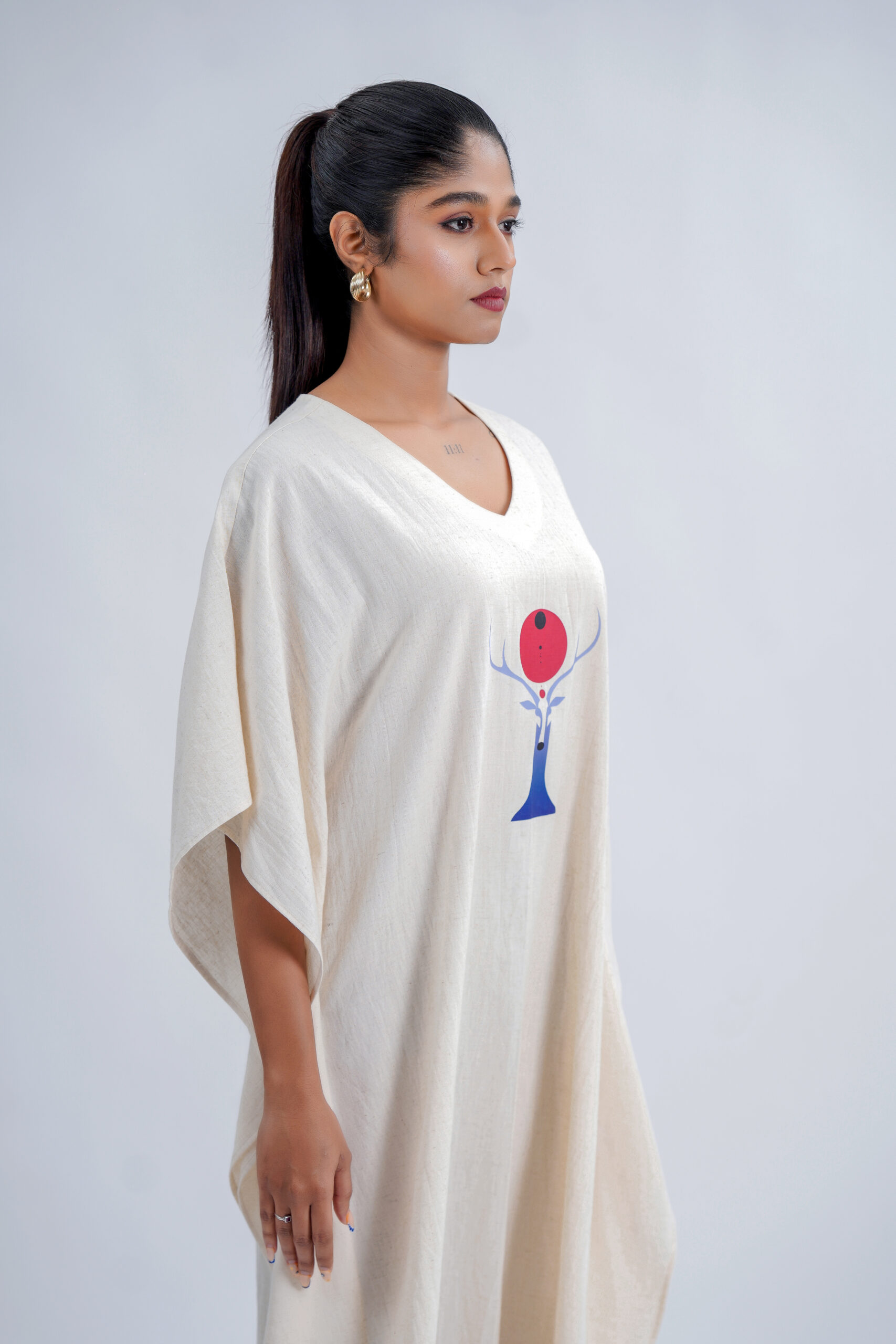 Crafted from a breathable linen-cotton , this free-size silhouette drapes effortlessly on every body type, offering unmatched comfort and elegance. The piece features an exclusive  Red Moon Deer motif, brought to life with premium DTF printing for lasting colour and intricate detailing. Designed and produced in our own unit, it reflects our sustainable, art-driven philosophy—from conscious creation to eco-thoughtful delivery.