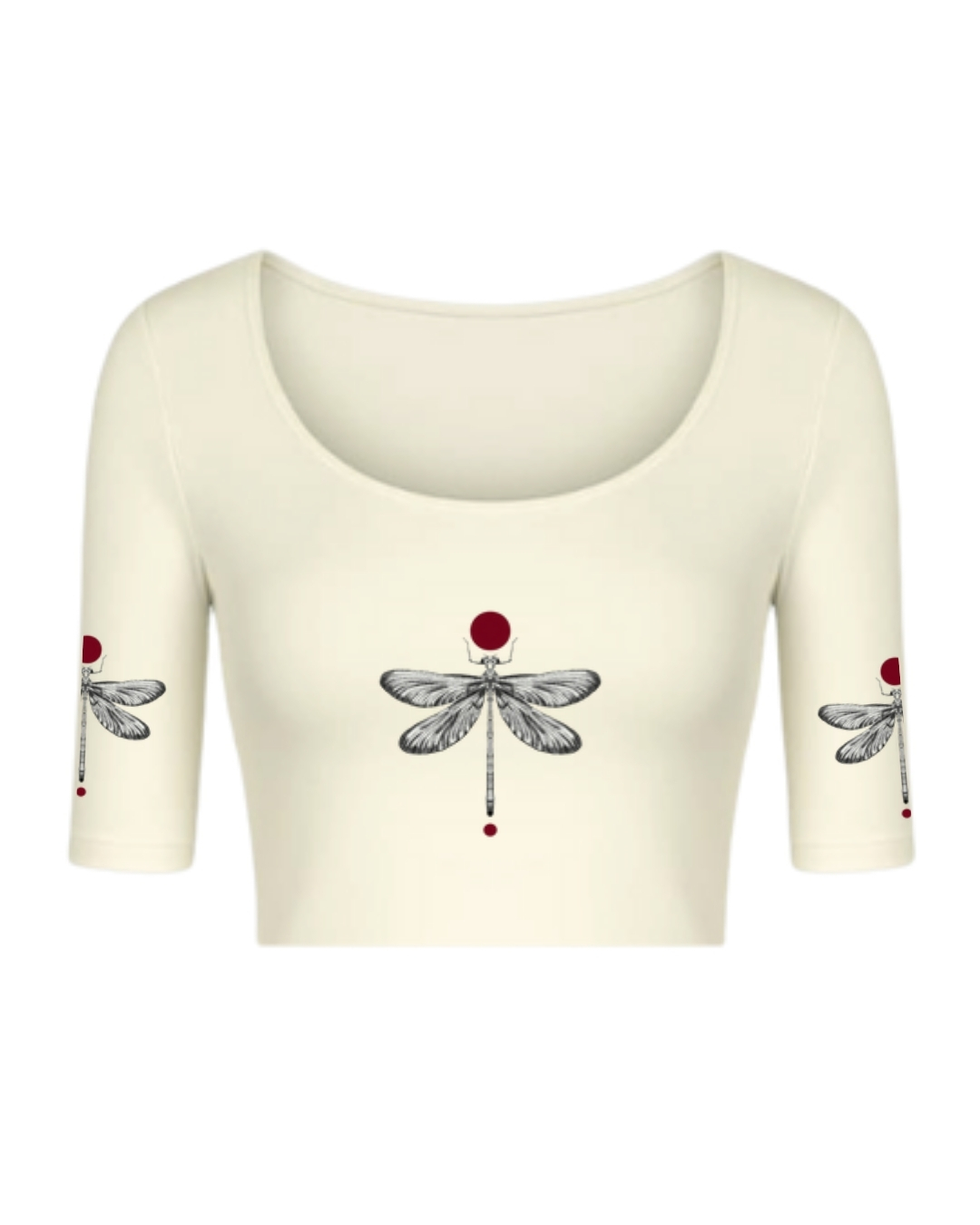 KNITTED COMFY HALF SLEEVE BLOUSE WITH DRAGONFLY PRINT