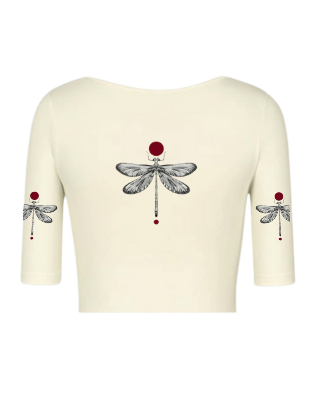 Elevate your festive and everyday looks with our Knitted Comfy Blouse, crafted from soft, stretchable knit fabric for all-day comfort. The serene ivory tone is adorned with an intricate dragonfly motif, symbolizing grace, transformation, and elegance. Designed with a flattering scoop neckline and half sleeves featuring coordinated sleeve prints, this blouse blends tradition with a modern edge. Perfect to pair with sarees for Onam celebrations and just as stylish for casual outings after the festivities.