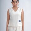This sleeveless short top is crafted from a breezy linen–cotton blend and detailed with our exclusive in-house Indigo Cat motif, printed using high-definition DTF technology for rich and lasting colour. The Notched collar silhouette gives a clean, elegant look that pairs effortlessly with skirts, pants or co-ords. Designed and produced sustainably in our own unit, this is an exclusive design you won’t find anywhere else.