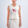 This sleeveless short top is crafted from a breezy linen–cotton blend and detailed with our exclusive in-house Red Deer motif, printed using high-definition DTF technology for rich and lasting colour. The V-neck silhouette gives a clean, elegant look that pairs effortlessly with skirts, pants or co-ords. Designed and produced sustainably in our own unit, this is an exclusive design you won’t find anywhere else.