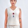 This sleeveless short top is crafted from a breezy linen–cotton blend and detailed with our exclusive in-house Red Moon Deer motif, printed using high-definition DTF technology for rich and lasting colour. The V-neck silhouette gives a clean, elegant look that pairs effortlessly with skirts, pants or co-ords. Designed and produced sustainably in our own unit, this is an exclusive design you won’t find anywhere else.