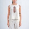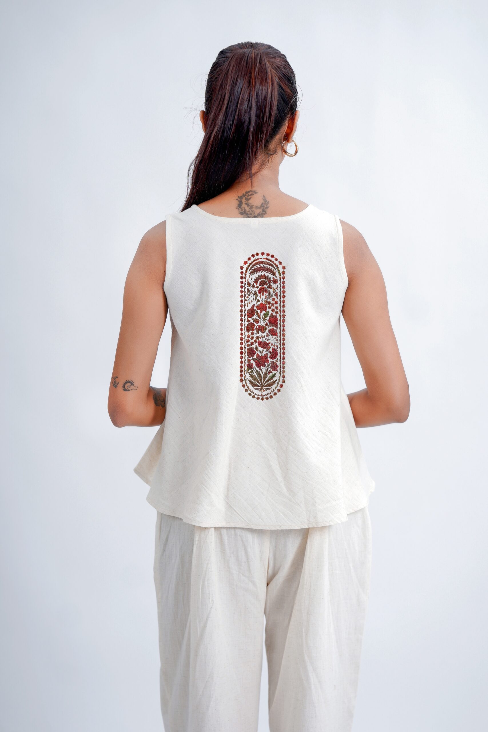 This sleeveless short top is crafted from a breezy linen–cotton blend and detailed with our exclusive in-house Red Ark motif, printed using high-definition DTF technology for rich and lasting colour. The Boat -neck silhouette gives a clean, elegant look that pairs effortlessly with skirts, pants or co-ords. Designed and produced sustainably in our own unit, this is an exclusive design you won’t find anywhere else.