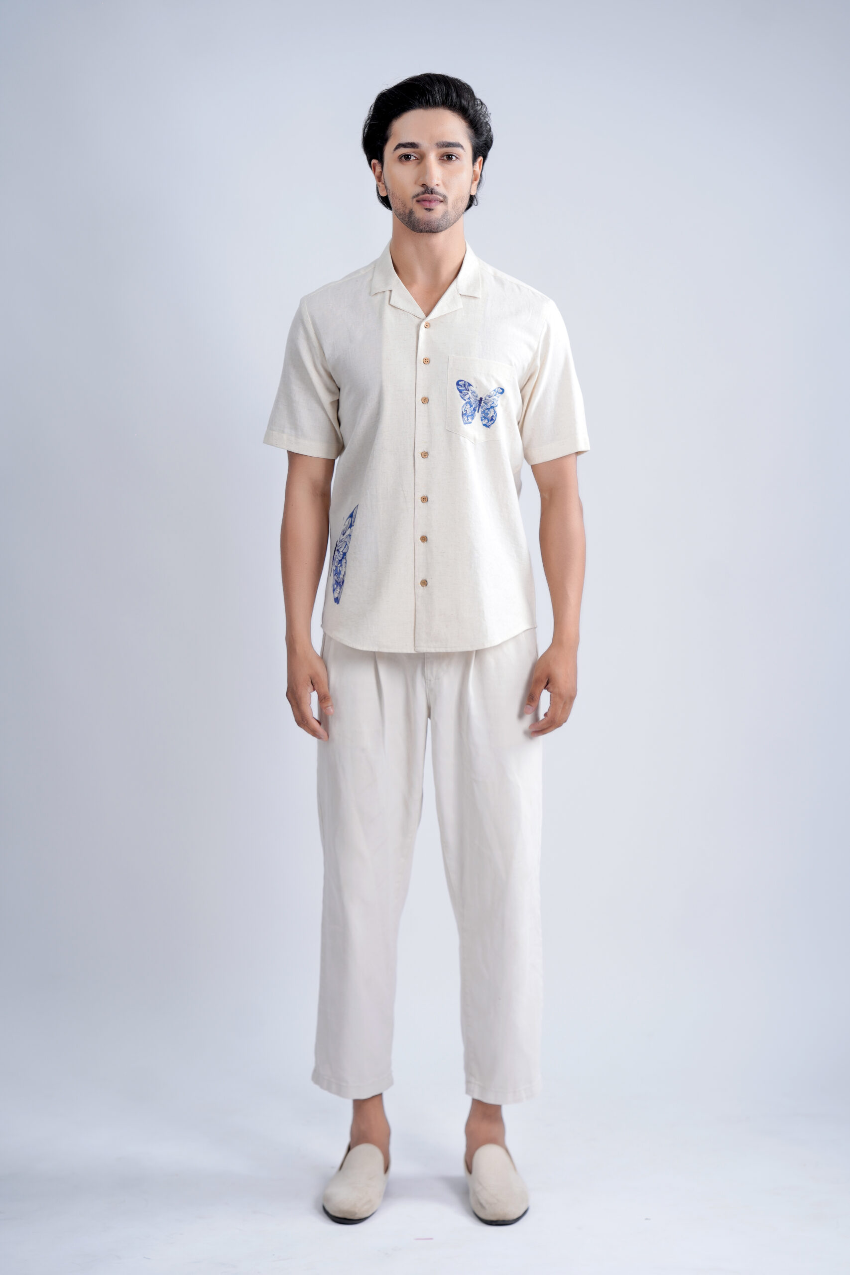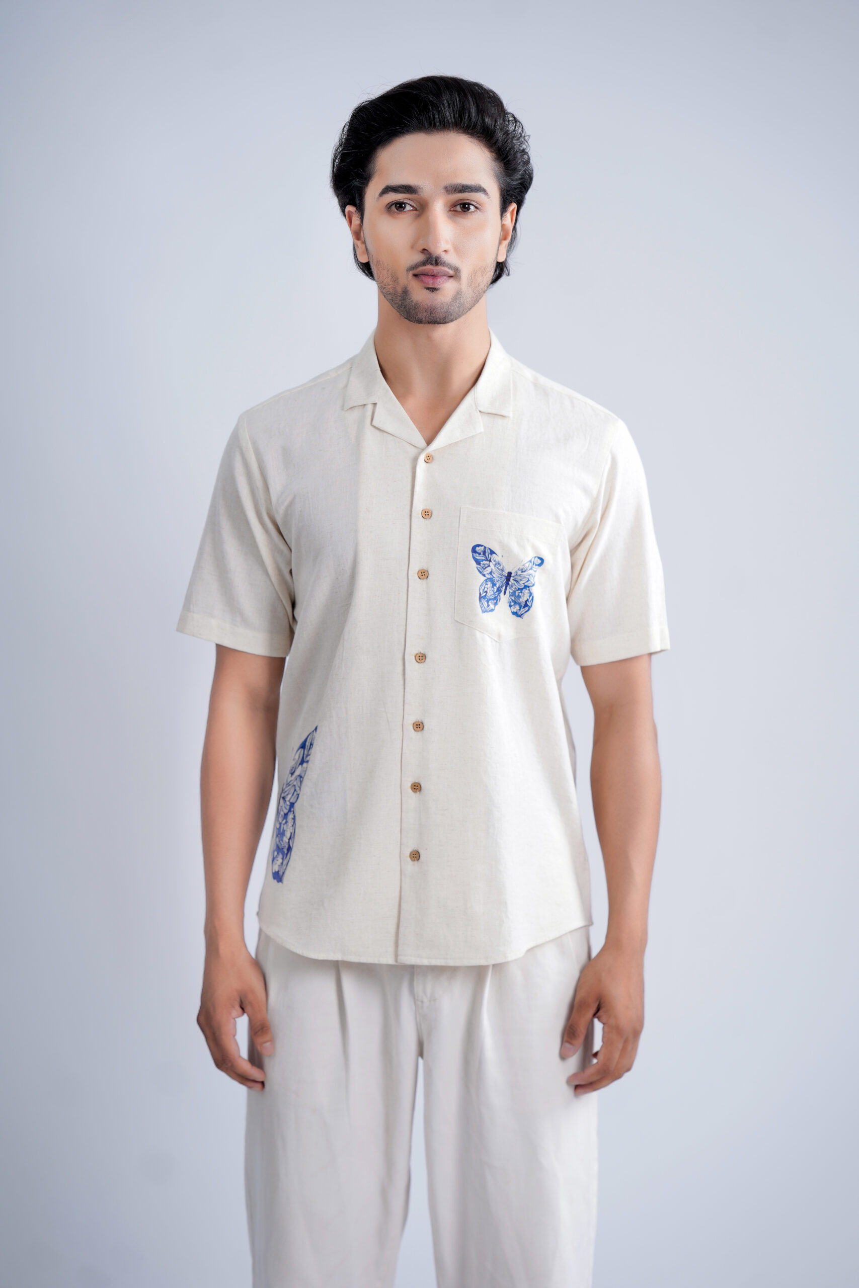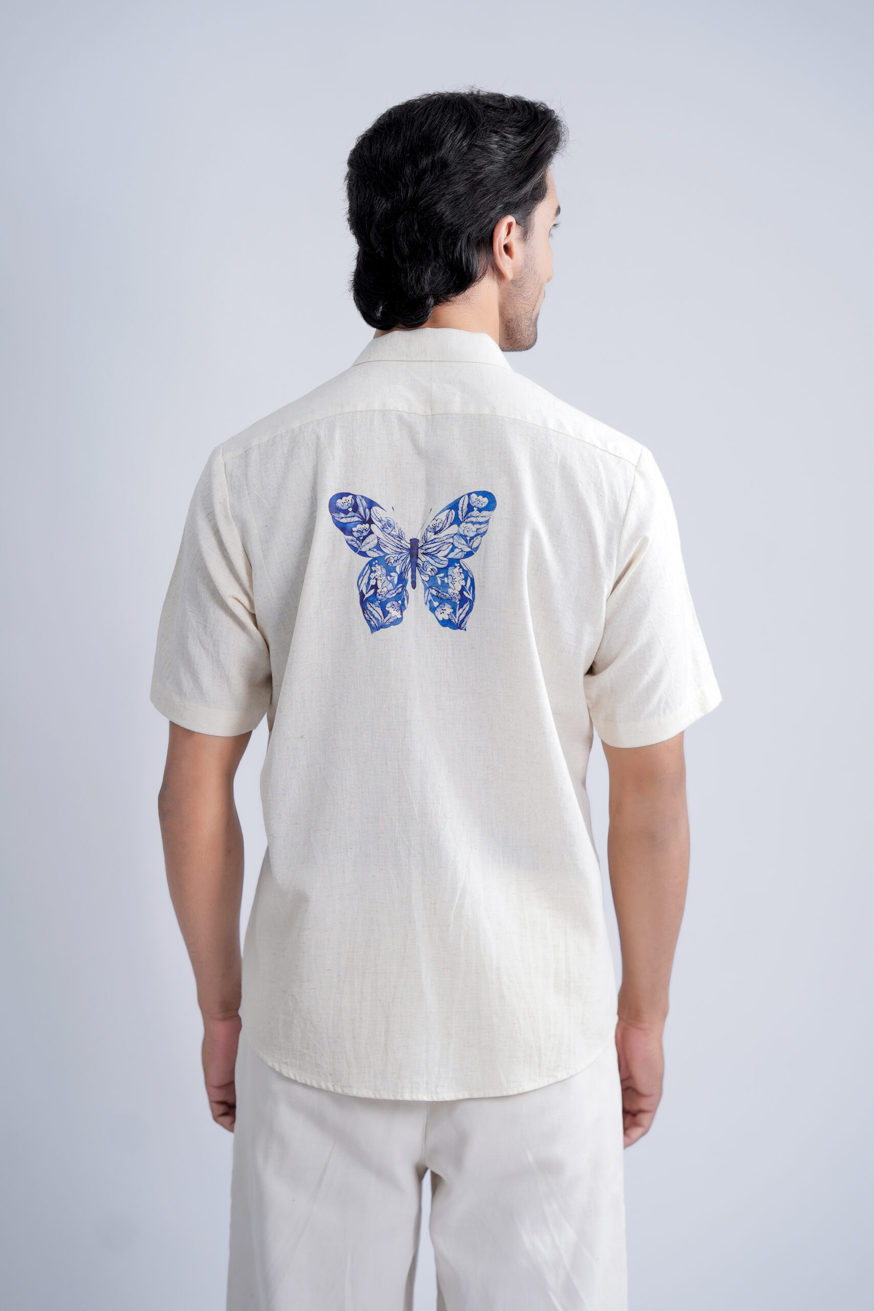 Crafted from a breathable linen-cotton , this piece features exclusive Indigo Butterfly motifs, printed using premium DTF technology for long-lasting colour and clarity. Finished with natural wooden buttons and crafted entirely in our own unit, it reflects our sustainable, art-first philosophy—from mindful production to eco-thoughtful delivery. Available in Half & Full Sleeves with Normal, Camp and Mandarin collars, this Regular Fit shirt offers all-day comfort with inclusive sizes up to 6XL.