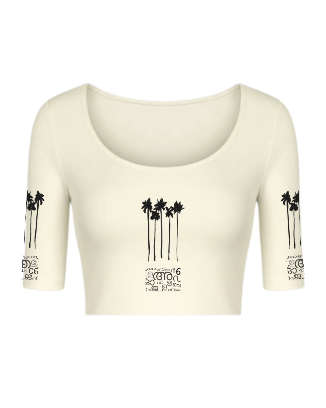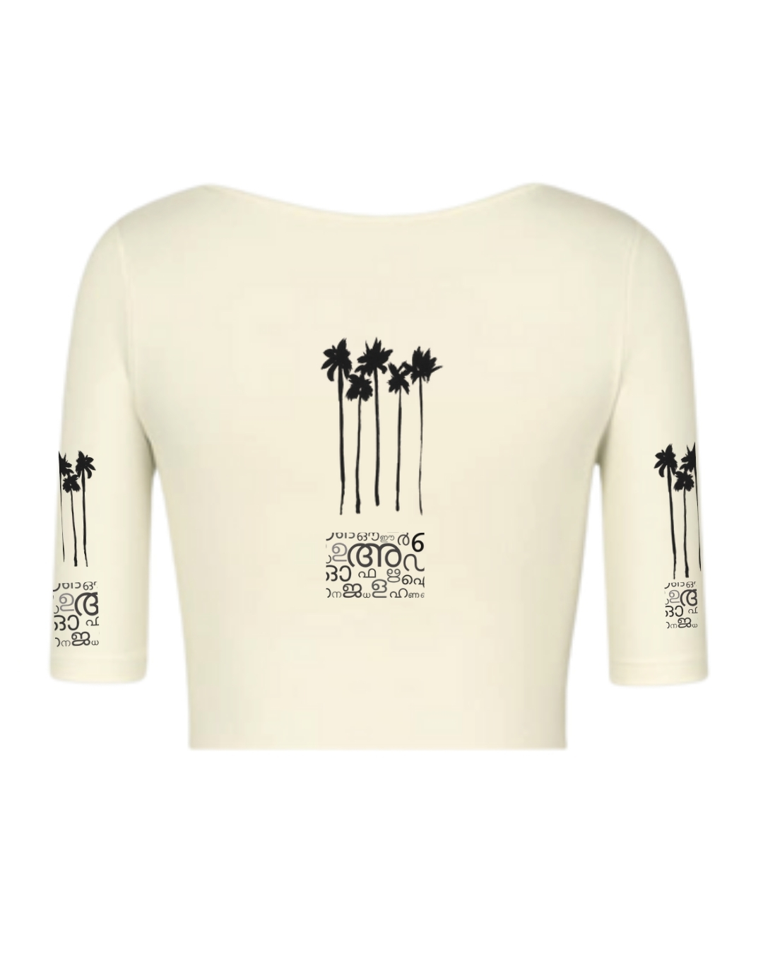 The highlight of this blouse is its unique coconut palm print —a minimal yet striking design that brings coastal vibes into your wardrobe. The elegant half-sleeves with palm motifs and the chic typography-inspired print add a modern, artsy touch to your traditional look.