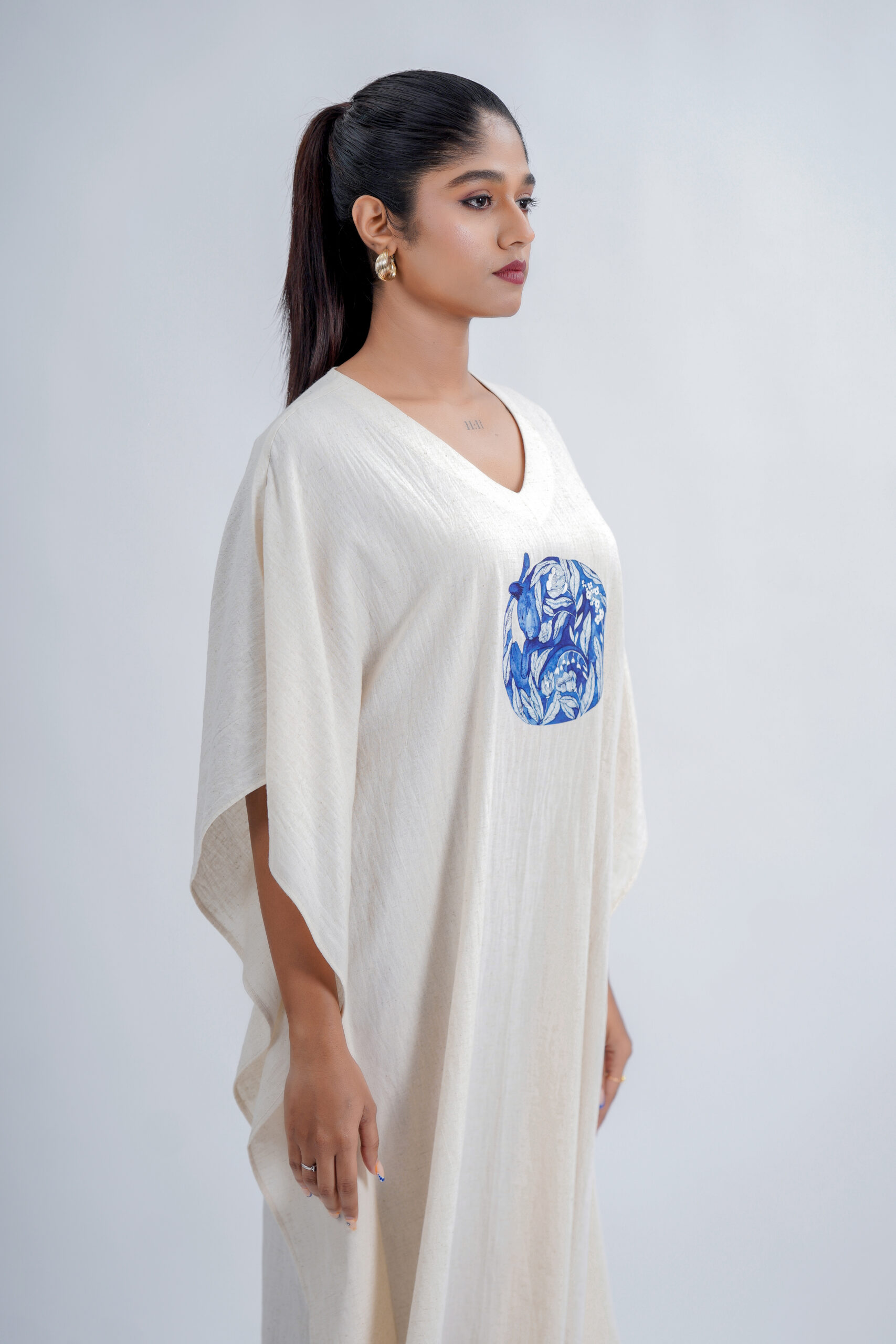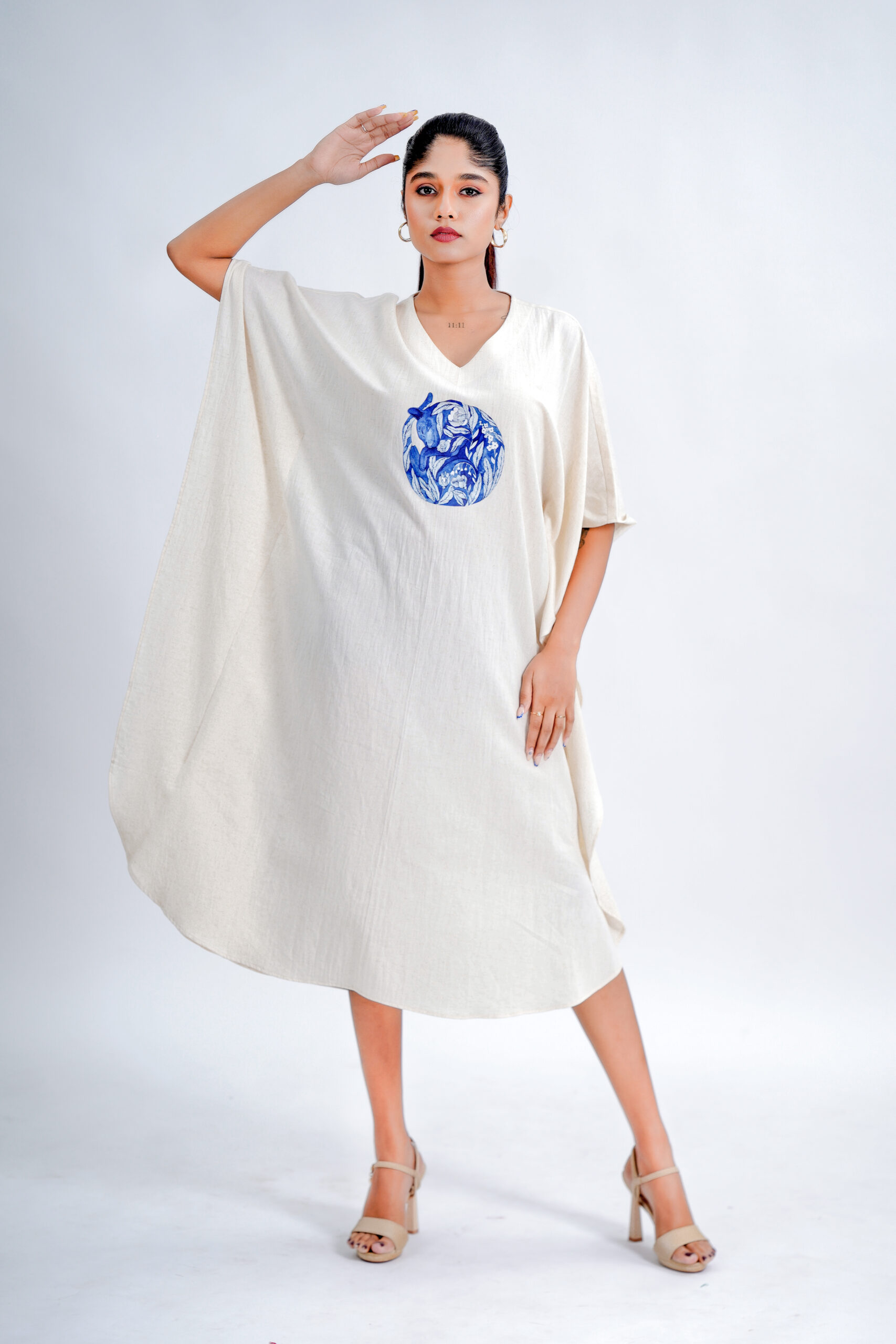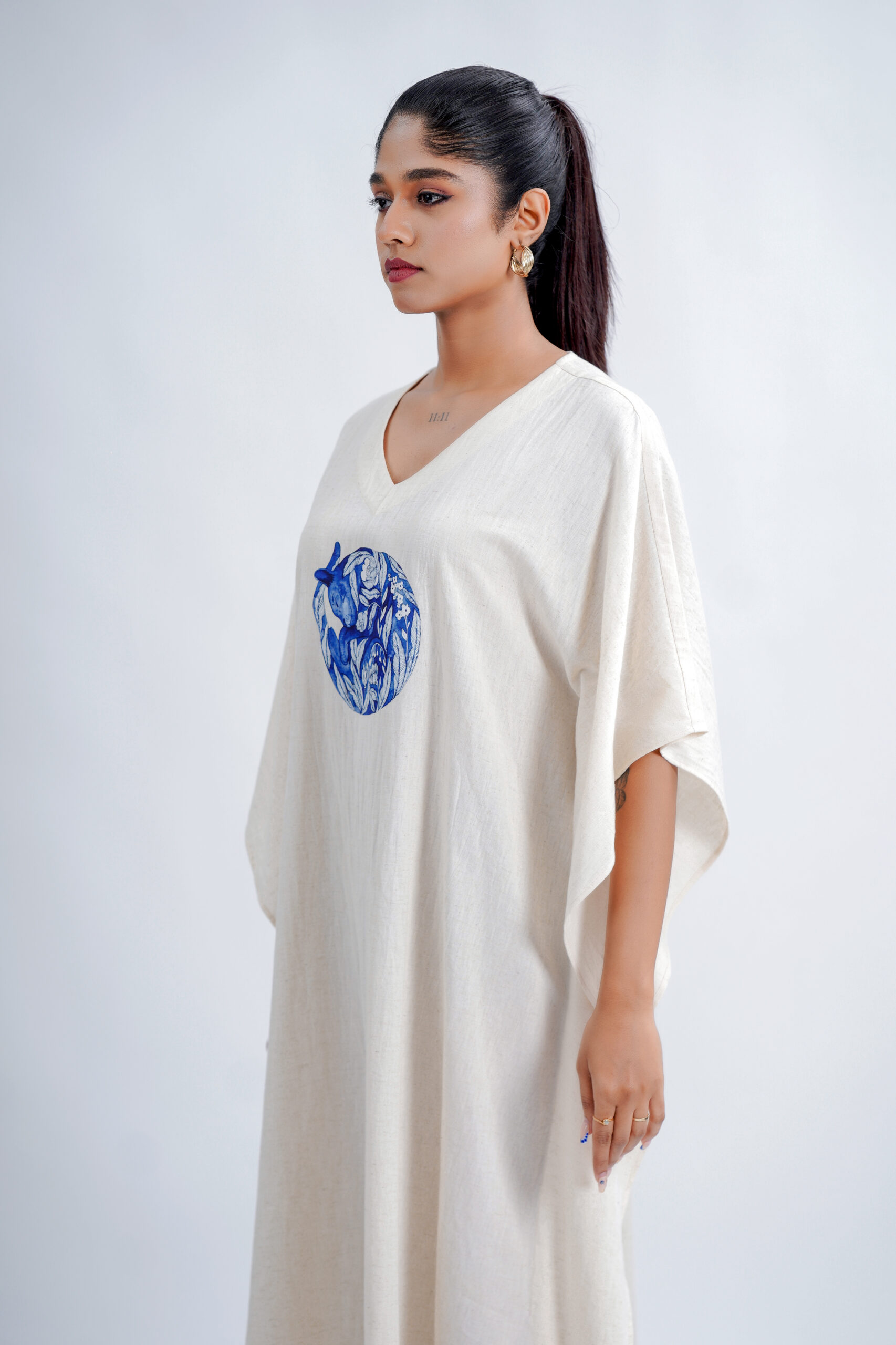 Crafted from a breathable linen-cotton , this free-size silhouette drapes effortlessly on every body type, offering unmatched comfort and elegance. The piece features an exclusive Indigo Cat motif, brought to life with premium DTF printing for lasting colour and intricate detailing. Designed and produced in our own unit, it reflects our sustainable, art-driven philosophy—from conscious creation to eco-thoughtful delivery.