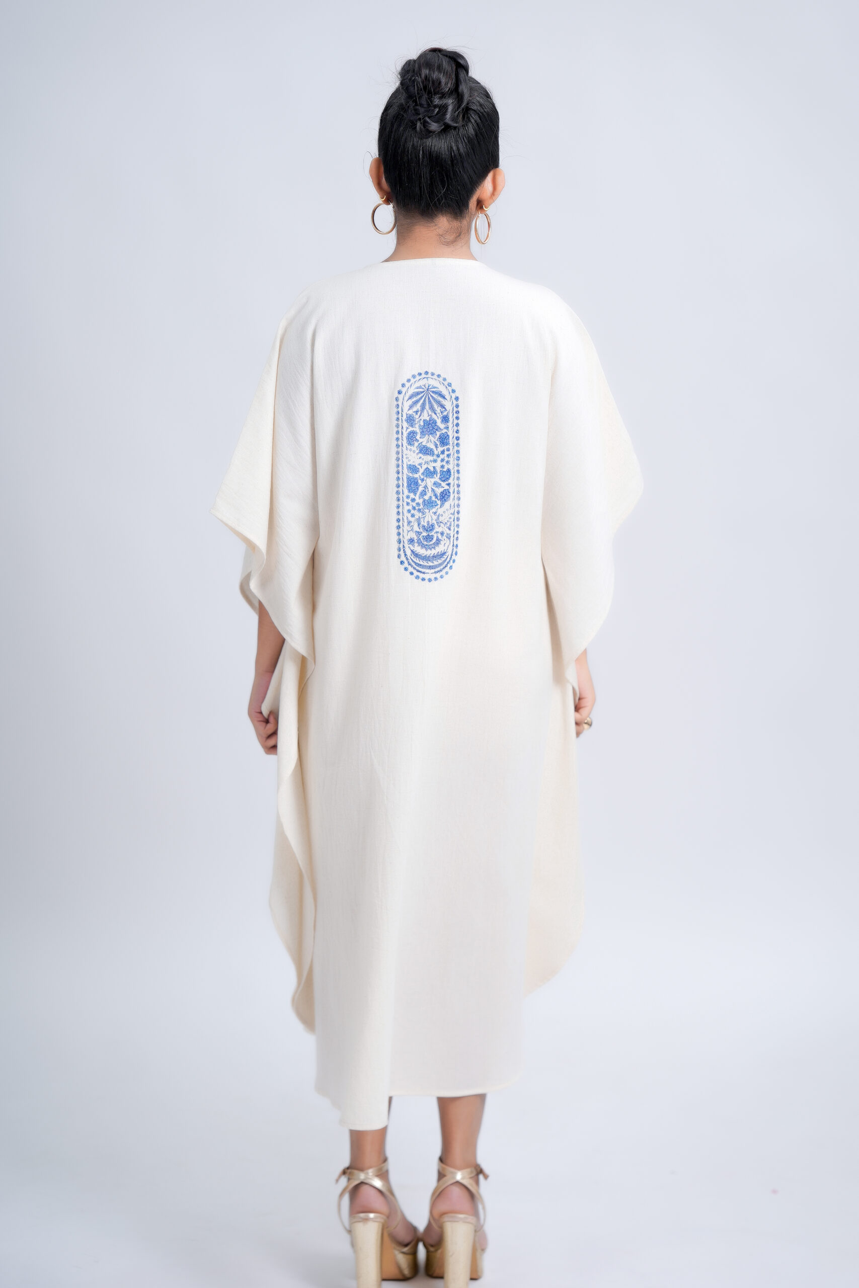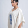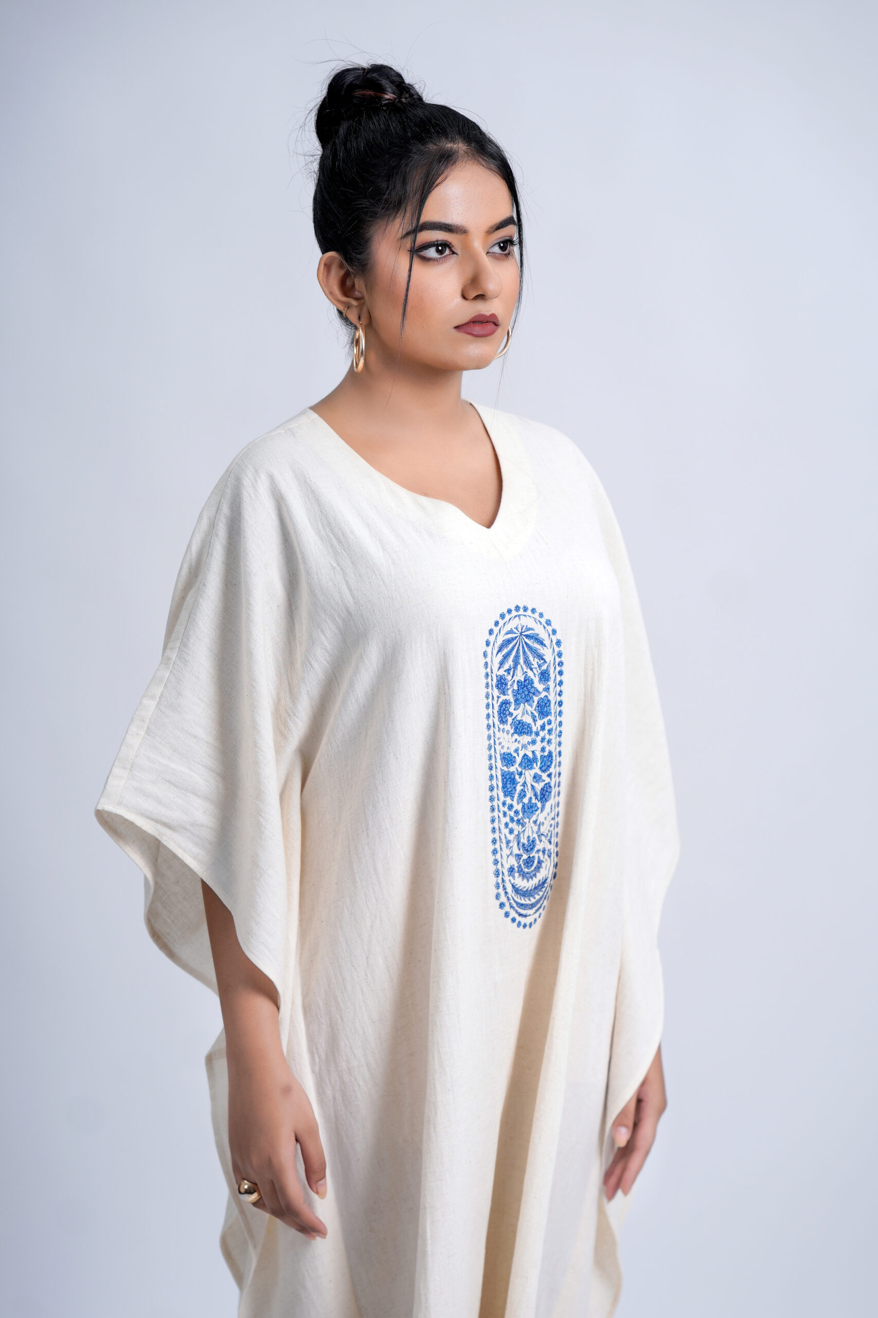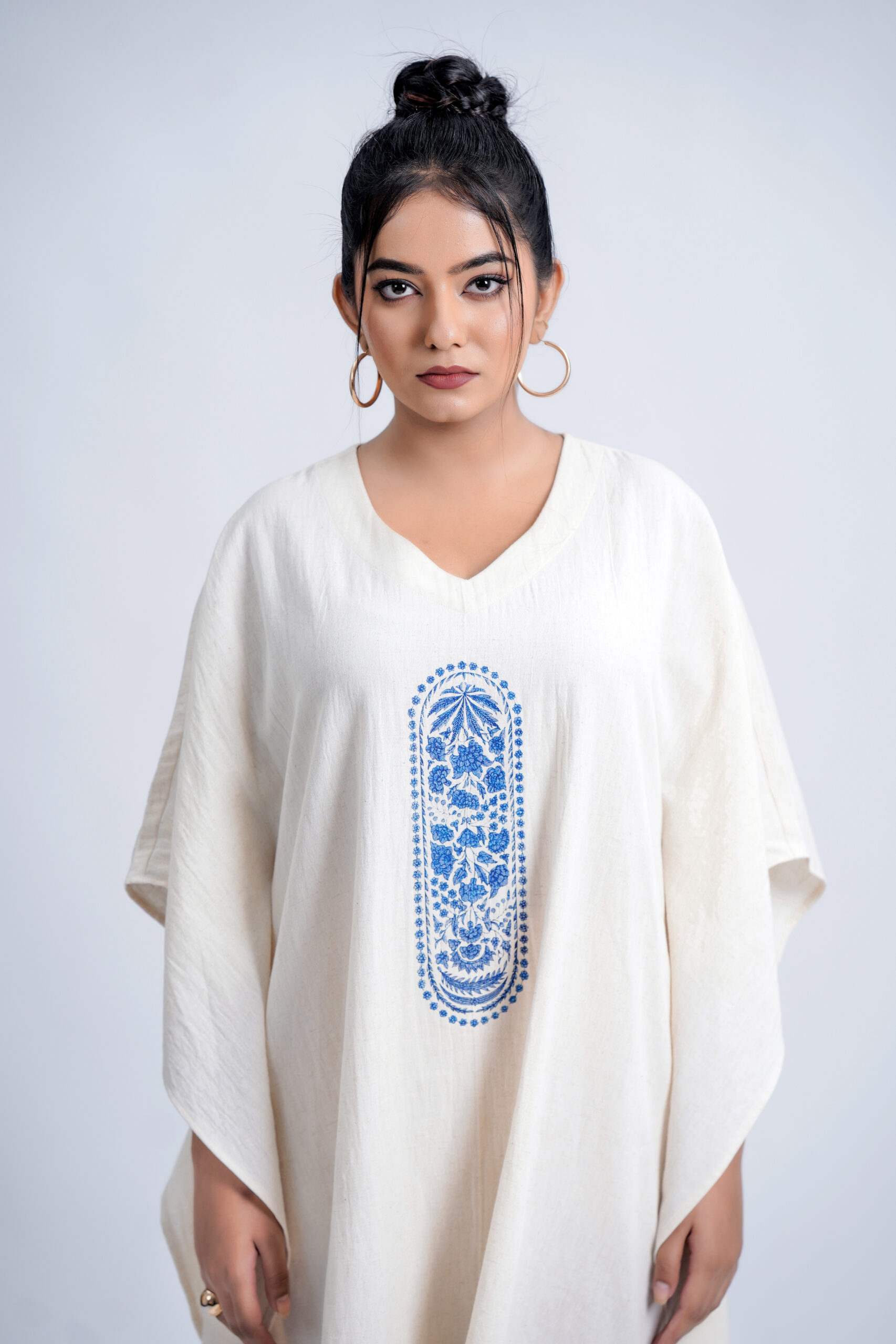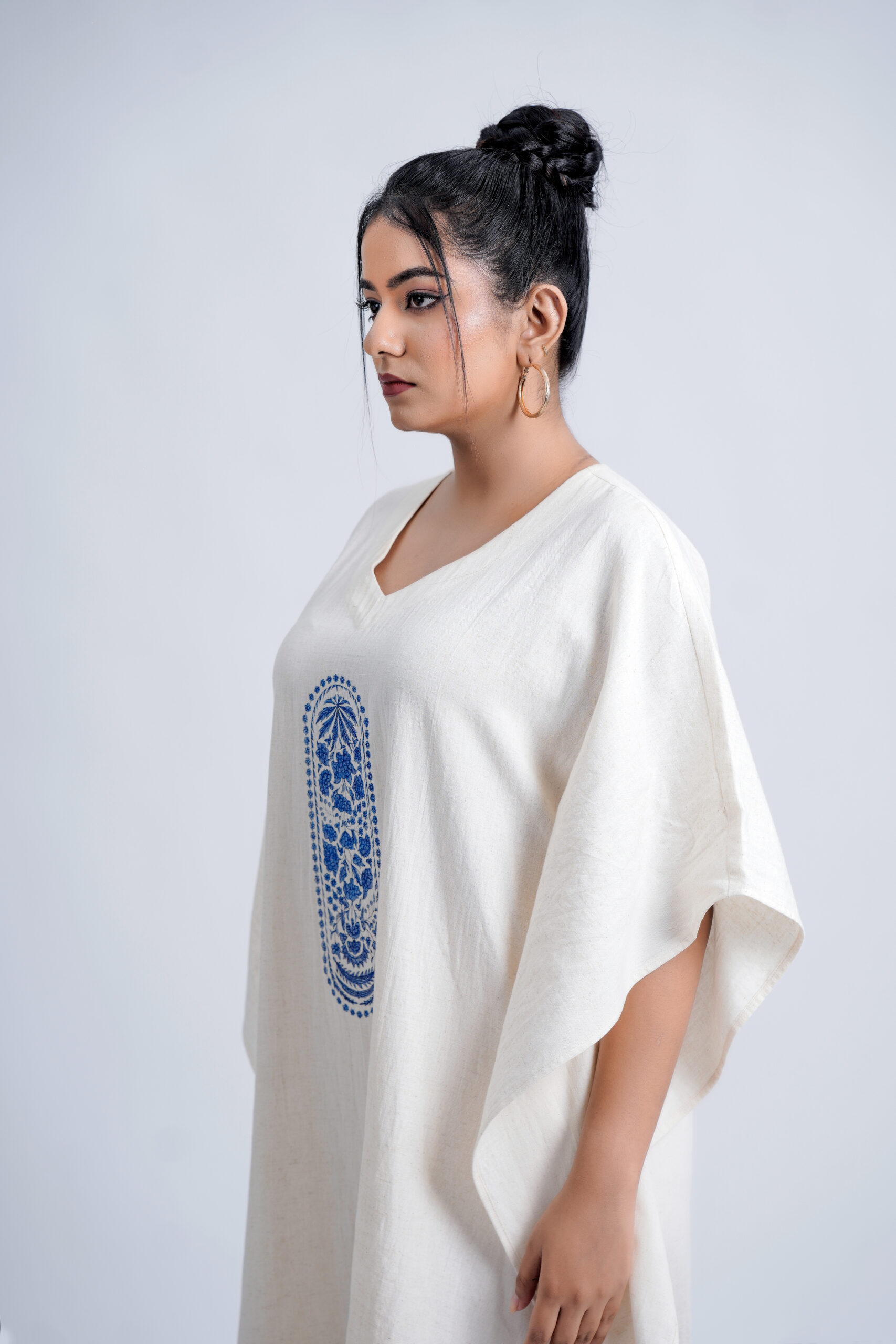 Crafted from a breathable linen-cotton , this free-size silhouette drapes effortlessly on every body type, offering unmatched comfort and elegance. The piece features an exclusive Indigo Pillar Floral motif, brought to life with premium DTF printing for lasting colour and intricate detailing. Designed and produced in our own unit, it reflects our sustainable, art-driven philosophy—from conscious creation to eco-thoughtful delivery.